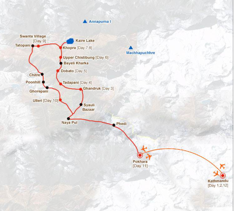 Frühmorgens Besuch des Poon Hill (3200m). Spaziergang nach Tikhedhunga/Tadapani oder Chhomrong, 3-4 Stunden, und Rückfahrt nach Pokhara, 3 Personen. -