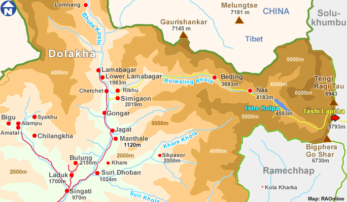 Trek von Na Gaon nach Dongang 2791m/7-8 Stunden Nach einer unvergesslichen Reise zum Gletschersee Tsho Rolpa kehren wir auf dem gleichen Weg zurück, folgen der gleichen Strecke nach Dongang. Wir beginnen den Weg nach Beding entlang des Rolwaling River. Nach Ihrer Ankunft in Beding können Sie sich ausruhen und das Dorf erkunden. Wir steigen durch den Wald mit Blick auf Gaurishankar (7134 m) ab, bis wir Dongang erreichen. Während der Wanderung gehen wir viele auf- und absteigende Wege. Übernachtung in einer Lodge in Dongang. -